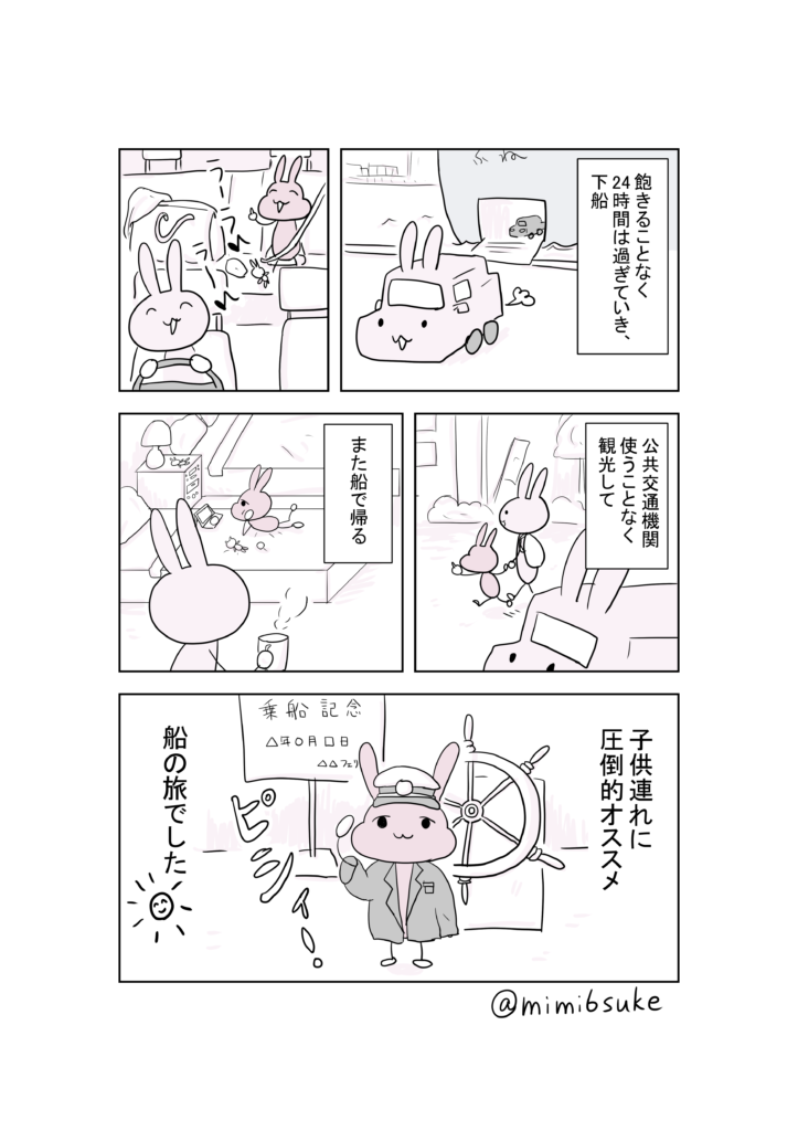 そんなに大きな声じゃなくても怖くてくうたんにシー!と怒ってしまってお互い疲れてしまうので、移動手段としてのフェリーは最高でした。